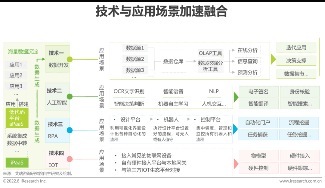 低代码平台可通过API等方式,在成本最小化条件下接入数据开发、人工智能、RPA、IOT等高研发密度类的科技功能板块,横向最大化扩展平台能力。能力的提升使得产品在专注自身业务成长的同时仍可进一步为需求侧提供打通数据孤岛、自动化重复劳动,智能化操作等高等级服务,加强业务场景的融合深度,进而提升产品可使用范围与粘性。如今,人工智能、大数据等边界正在逐渐模糊,并成为彼此发展动力,技术的交互提供更优质的服务体验,也满足了VUCA时代下企业对智能用数及敏捷决策的迫切需求。未来,低代码将进一步增加数据开发、人工智能、RPA、IOT相关细分能力的调用量,从而发展更多垂直业务场景的解决方案,加速企业全面深入数字化转型。中国数字化转型网www.szhzxw.cn