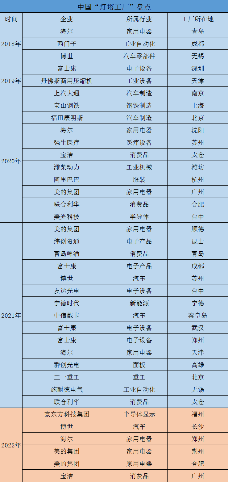 3月30日,世界经济论坛宣布有13家新工厂加入其全球灯塔网络。此次新增的13家灯塔工厂中有6家来自中国,分别是京东方科技集团福州工厂、博世长沙工厂、海尔郑州工厂、美的荆州工厂、美的合肥工厂、宝洁广州工厂。迄今为止,全球范围内共认证了103家灯塔工厂,其中37家位于中国。