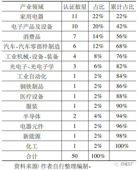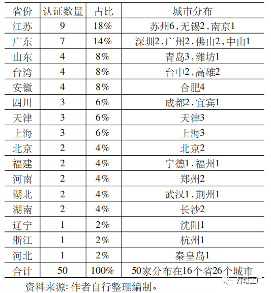中国获评“灯塔工厂”50家(其中大陆46家,台湾地区4家),约占全球获评数量的4成,成为世界上拥有最多“灯塔工厂”的国家,与中国制造业在全球的地位基本相称。选择中国获评“灯塔工厂”作为研究对象,可以很好地总结我国先进制造企业的数字化改造经验。因此我们通过网站、专题新闻报道以及研究报告,收集了这50家中国获评“灯塔工厂”的相关信息,进行了横向企业层面的统计分析。
