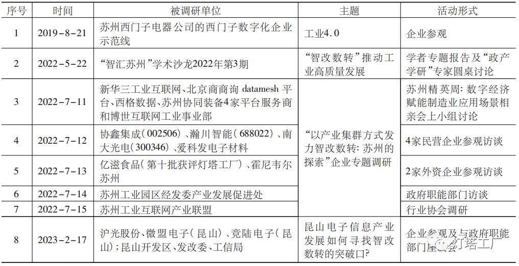 苏州规上企业工业总产值2021年末到达41308.1亿元,全国城市排名第二;根据工信联《全国两化融合发展水平区域比较》,江苏省工业化和信息化融合发展水平连续七年位居全国第一,而苏州又在“两化融合”方面的成绩全省领先;苏州在中国获评“灯塔工厂”数量的城市排名第一(表2)。为此我们课题组6人(其中3位教授,3位博士)历时三年半,长期跟踪工业4.0和制造业数字化改造实践,并在苏州当地开展了一系列调研活动,参见表5。
