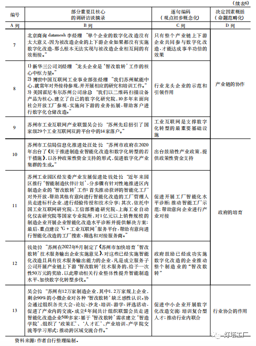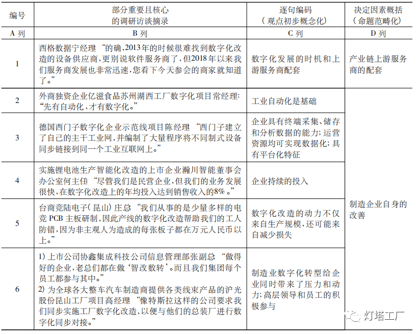 随后,在初步概念化的基础上,继续按照纵向产业链上各参与者观点,对数字化改造的决定因素这一命题进行范畴化,参见表6D列,整个范畴化过程的分析如下:数字化转型网www.szhzxw.cn