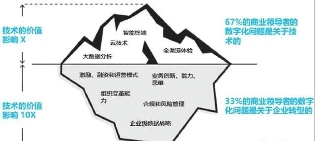 大部分管理者关注的数字化问题相当于冰山的表面,但少部分领先企业管理者关注的是深埋在水面之下的更深层次的问题,水面之下的冰山对企业数字化转型的价值10倍于冰山表面,也可以说,数字化转型的关键因素隐藏在冰山下面。