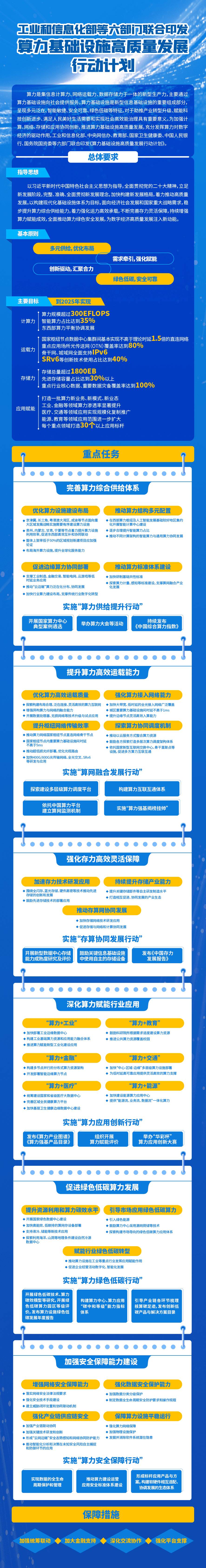 《行动计划》结合算力基础设施产业现状和发展趋势,明确了“多元供给,优化布局;需求牵引,强化赋能;创新驱动,汇聚合力;绿色低碳,安全可靠”的基本原则,制定了到2025年的主要发展目标,提出了完善算力综合供给体系、提升算力高效运载能力、强化存力高效灵活保障、深化算力赋能行业应用、促进绿色低碳算力发展、加强安全保障能力建设等六方面重点任务,着力推动算力基础设施高质量发展。