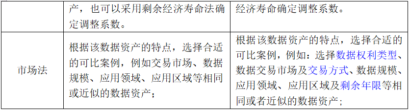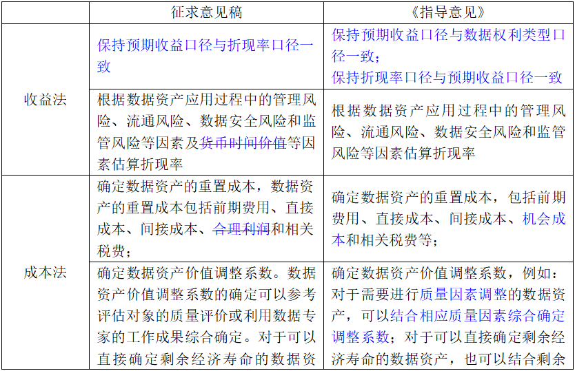 《指导意见》和征求意见稿均指出确定数据资产价值的评估方法包括收益法、成本法和市场法三种基本方法及其衍生方法,但在细节上存在略微改动(见表4)。