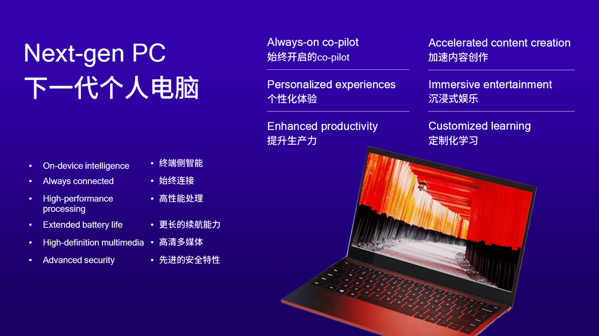 在个人电脑(PC)方面,智能和连接正在变革这一设备,提升了生产力,并推动了移动办公的发展。终端侧AI有助于降低数据中心的成本,保证数据安全。由此我们相信,下一代PC会进入一个新的AI PC的时代。这一时代的AI PC以智能、联网、高性能、高效、多媒体和安全为特点,对于办公效率、个人隐私等方面都具有重要意义。它能够改善个性化体验,基于用户具体所在位置、所处场景和所做的工作,AI PC能够提供需要的数据,也可以帮助提高生产力、生成文档、制作演示文档、进行信息检索等。