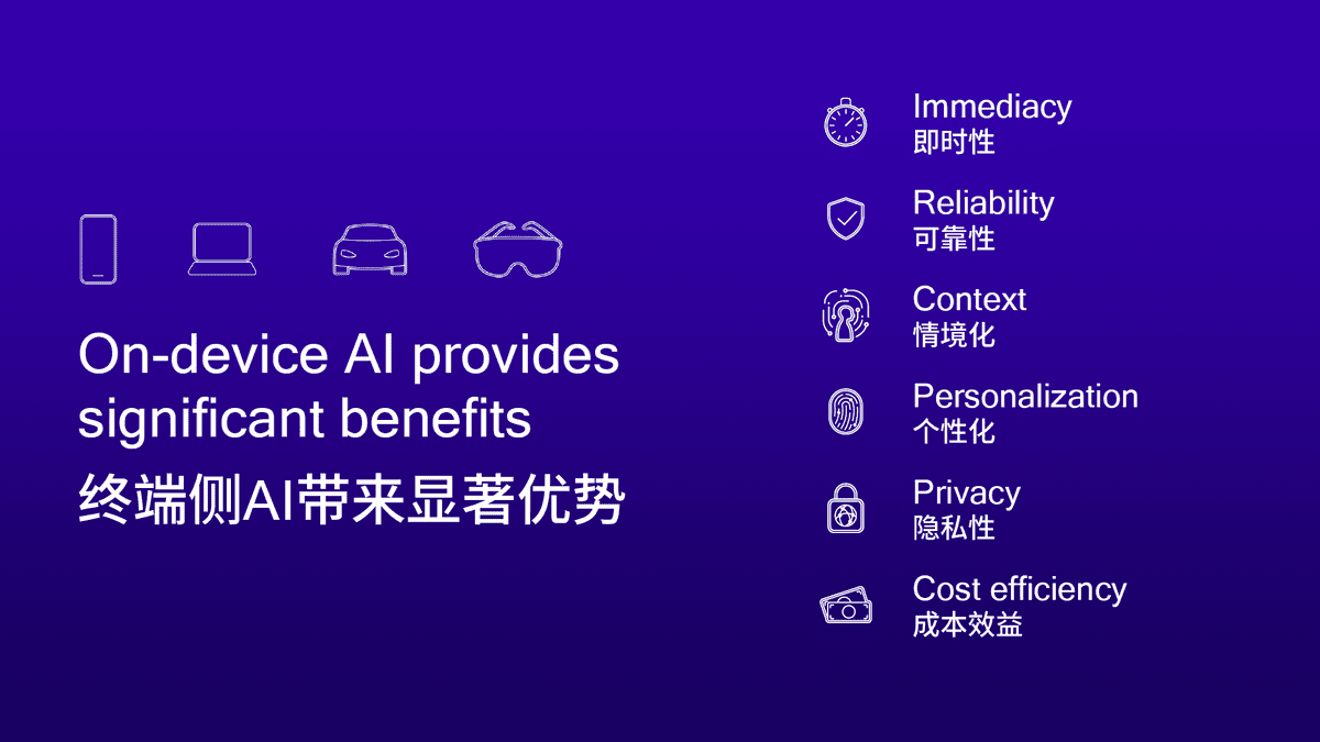 云端AI和边缘AI的发展各有不同。AI在云端的发展非常重要,未来也将继续发挥重要作用。同时,AI在边缘侧终端的发展也十分重要。随着技术的演进,每个人每天使用的终端设备,它所接收的信息具有即时性,例如,了解用户的实时位置信息,或者接受类似的仅限于终端侧的内容。云端的通用大模型并不能获得这些即时信息,云端大模型训练所得到的数据,通常是基于过去某一个时间段内的信息,并不能与用户当下所处的环境匹配。云端AI的可靠性在一定程度上会受到连接的影响,而终端侧AI在可靠性、情境化和个性化方面都更具优势,因为我们的终端也在不断发展变化。