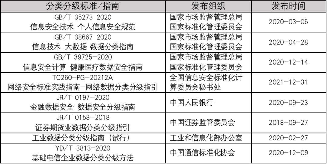 企业在对数据进行分类分级之前,需要先制定分类分级标准规范。目前,国家已经颁布的分类分级标准有针对个人信息的GB/T 35273-2020 《信息安全技术个人信息安全规范》;同时,各行业、组织也已经推出了数据分类分级的实施指南,例如 JR/T0158-2018《证券期货业数据分类分级指引》、JR/T0197—2020《金融数据安全 数据安全分级指南》、YDT3813-2021《基础电信企业数据分类分级方法》等。
