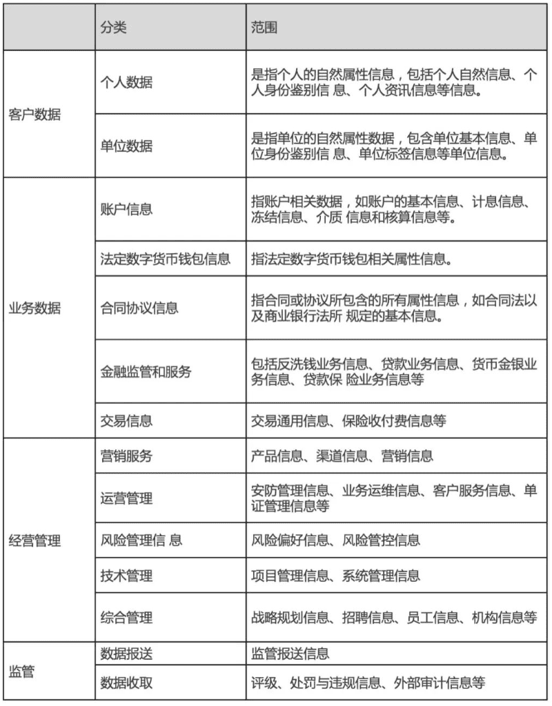 以金融行业为例,金融领域的数据分类分级方法主要体现在《金融数据安全 数据安全分级指南》(JR/T0197—2020)和《证券期货业数据分类分级指引》(JR/T0158-2018)中,其中前者将数据分成客户数据、业务数据、经营管理数据三类,客户数据又分为个人客户和单位客户,业务数据则根据不同的业务线再做细分,经营管理数据包括营销服务、运营管理、技术管理、综合管理(员工、财务、行政、机构信息)等(如下表所示)。 数字化转型网www.szhzxw.cn