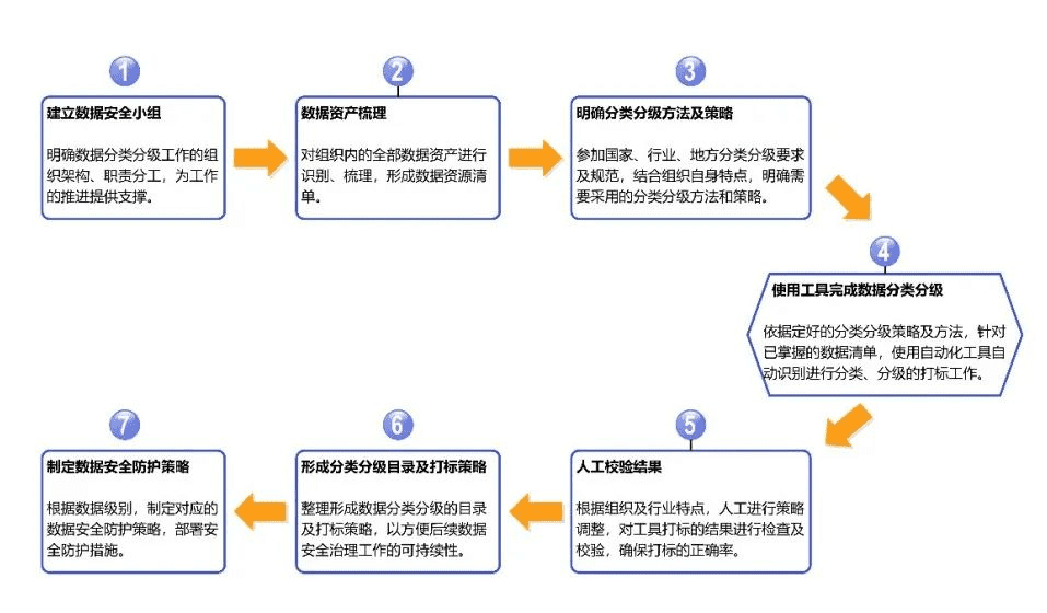The general process of enterprise data classification and classification is covered in many standard documents and is roughly similar. Such as determining data security project team, sorting out data assets, determining standards and principles, classifying data, delineating security levels. And formulating data security protection policies (specific implementation steps are shown in the following figure).
