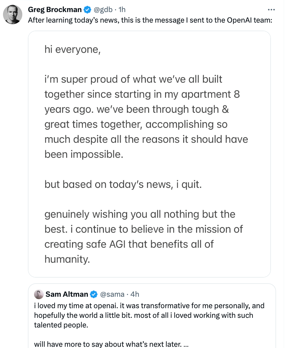 On November 18, Sam said on his social media account that he enjoyed his time at OpenAI and would announce his next arrangement later. Greg then retweeted the post and said that after learning of the news, he sent a message to OpenAI saying that he had decided to quit OpenAI.