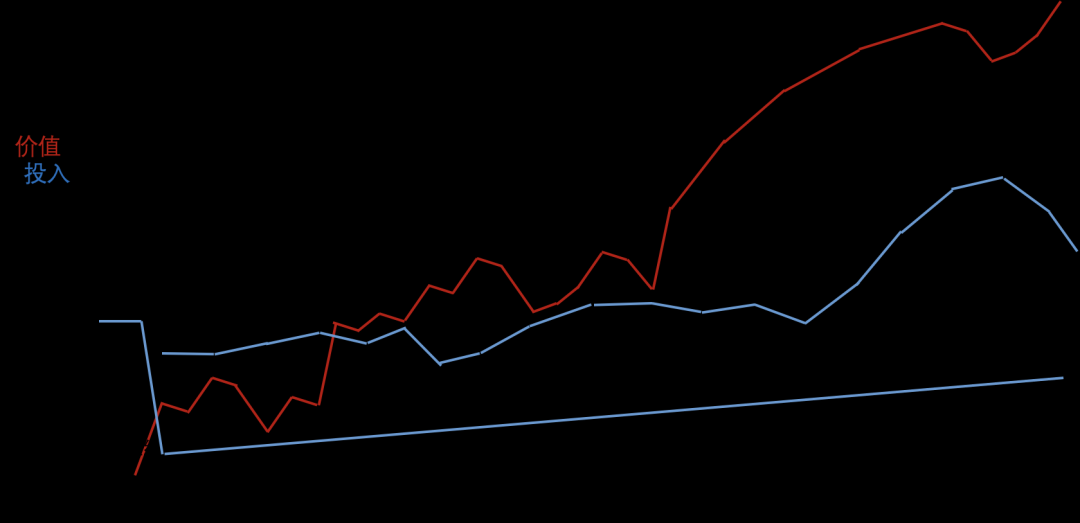 As shown above, this is a typical software lifecycle, where the blue line represents input and the red line represents value. Although there is a period of start-up time, the value creation of software starts from the real launch for customers to use, and it is continuously created during the process of customer use until no customers use it or the software fails to make ends meet, the value creation stops and the software life cycle ends. In the process of software use, the value created by the software to the customer will decrease over time, this may be because the value demands of the customer have changed, it may be because the competitor has pulled away some users, and it may be because the software experience has decreased over time. 数字化转型网www.szhzxw.cn