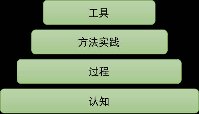 如上图,这是《软件工程:实践者的研究方法》一书中定义的软件工程基本框架,它把软件工程分为四层,认知是整个软件工程的基石,它代表了软件工程的基本假设和指导思想;过程是基础、是骨架,它把所有工作串联到一起;方法实践是血肉,它们为实际工作提供技术指导;工具是承载,它让过程、方法实践变得更加高效。(本图源自《软件工程:实践者的研究方法》第七版)