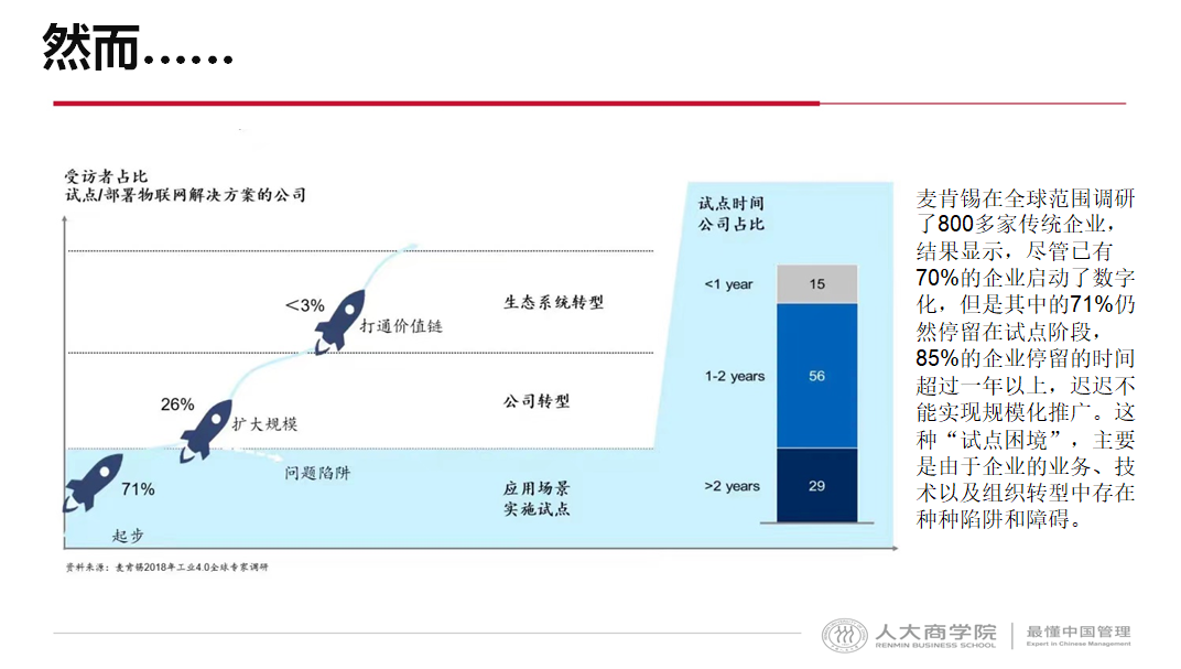 我们进一步看一下实际转型的现状。在麦肯锡的全球调研中发现,800家企业中,70%以上的企业启动数字化转型,但是其中的71%仍然停留在试点阶段,都在做0到1的探索。85%的企业试点停留的时间超过一年以上,迟迟不能实现规模化推广,没有真正产生价值,也说明了它的难度。