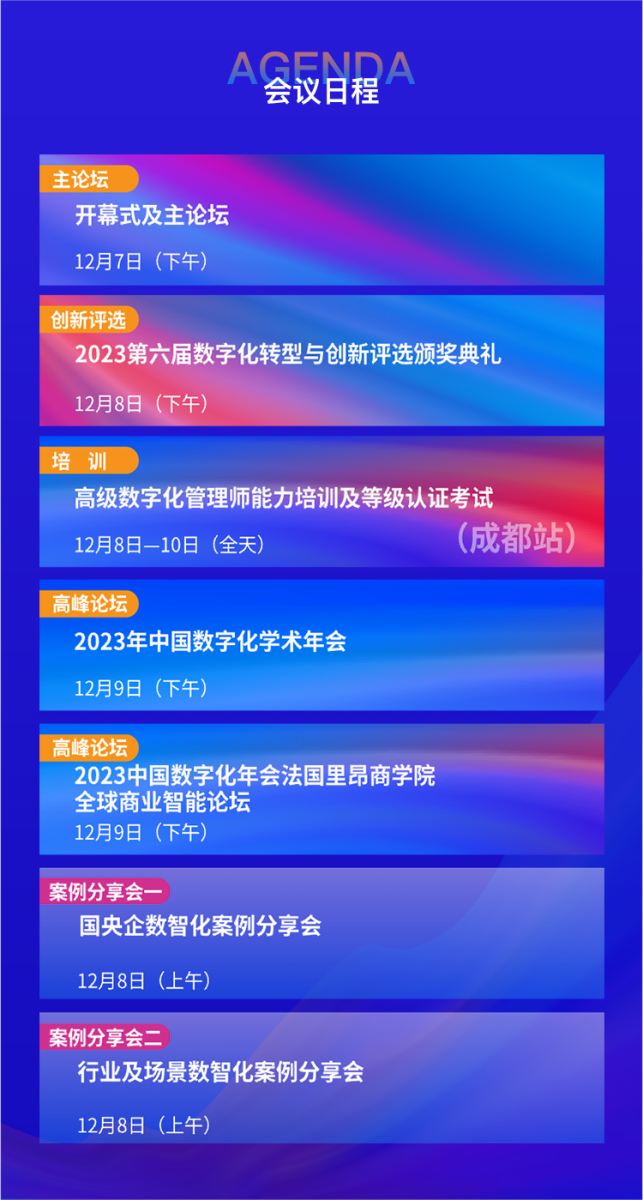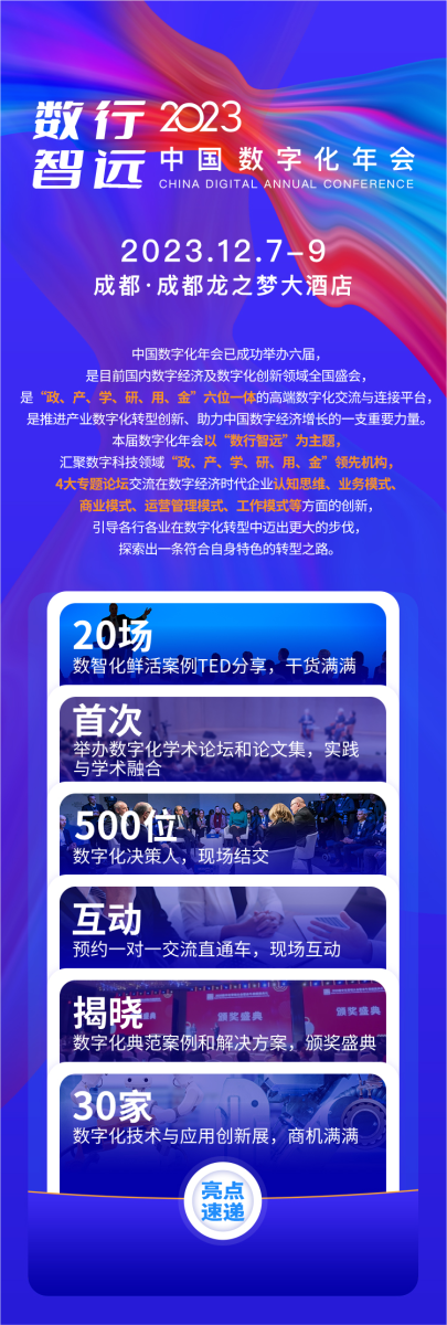 2023中国数字化年会将以“数行智远”为主题,于12月7日-9日通过线上线下相融合的方式举办。本届年会由1场开幕式及主论坛、2场高峰论坛2场专题论坛、3项特色活动、1场榜单发布等9项活动,以及3天线上数字化技术与应用创新展组成。将汇聚来自数字科技领域“政、产、学、研、用、金”领先机构专家、行业翘楚出席,以演讲、发布、高峰对话等多种形式,结合数字经济、AIGC、数据要素等领域的焦点与痛点话题,为参会者提供权威参考与核心启示,引导各行各业在数字化转型中迈出更大的步伐,探索出一条符合自身特色的转型之路。 数字化转型网(www.szhzxw.cn)