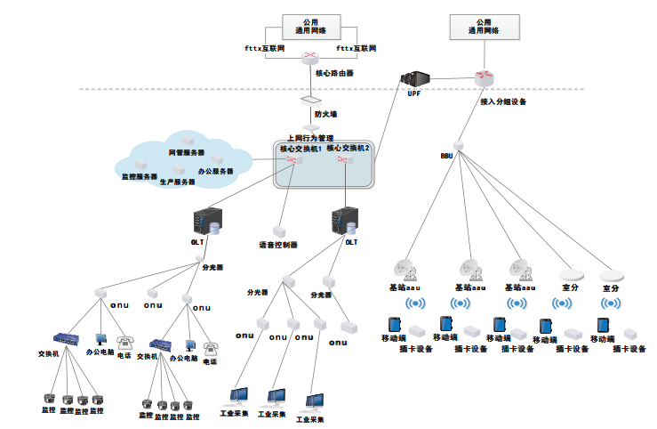 ①工业环网改造。以光缆基础网为基础,建立一套工业环网,将承载不同业务的网络整合,消除多张网络并用带来的建设费用高、维护升级困难等问题。以企业总机房为中心机房,机房内安装智能城域网接入设备(以具体业务为依据合理配置),上联到智能城域网,承载5G网络。部署设备包含:1台核心路由器、1台防火墙、1台上网行为管理器、2台核心交换机(一主一备)、2台OLT(一主一备)、若干ONU、MDU、语音网关、语音控制器等设备,承载厂区语音通话、办公、监控、生产,如图2所示。