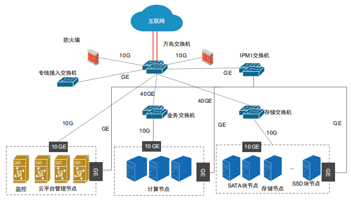 其中,三个逻辑区域分别为计算节点集群、存储节点集群、监控管理集群。物理连接方面延续沃云标准架构中的组网模式,万兆交换机分别承载计算和存储区域内的数据流量,通过核心交换机将数据汇聚,其中核心交换机旁挂防火墙保障安全边界。