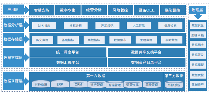 如图4所示,数据架构主要特点有:建设数据中台,汇集企业数据(财务系统、ERP、CRM、设备数据等各原有和新建系统中的数据),梳理并持续更新数据资产目录,提供数据汇聚、数据存储、数据分析、数据共享、数据交换、数据治理、数据复用等能力,为不同用户提供一站式全业务链的数据服务。以“业务数据化、数据资产化、资产服务化、服务业务化”为纲领,建设数据能力,构建数据驱动的智能企业。