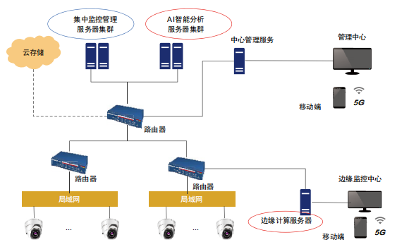 本方案在园区门岗、生产区域及其它重点区域调用或部署前端采集、抓拍设备,将业务数据汇聚集中回传到数据中心,由算法服务器和管理平台提供相应的技术服务。视频AI能力部署如图5所示。