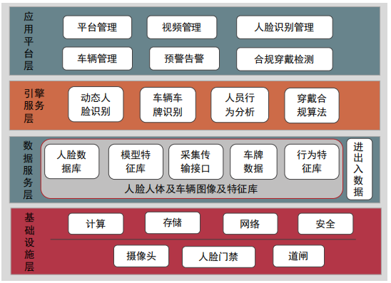 AI视频分析系统可以与整体方案进行数据交互,同步现有人员、车辆信息数据,便于工作人员管理,同时服务各个系统间的信息共享和业务协同。系统提供对外接口,可定制化开发数据传输对接原有和新建系统,实现系统间联动,提高方案可行性和系统可用性。总体架构由基础设施层、数据服务层、引擎服务层、应用平台层组成,如图6所示。