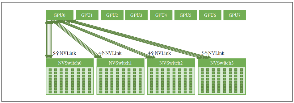 SXM 扣卡模组是芯片厂商自有设计标准,基板不仅集成了 8 张 GPU 卡,同时还集成了 NVSwitch 芯片,每个 NVSwitch(第 4 代)都有 64 个 NVLink 网络端口,可以将 8 张 GPU 卡全部连接起来,是实现 8 卡之间端到端全互联的关键组件。卡间互联架构示意如图 3 所示。