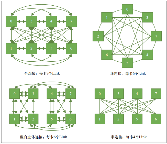 OAM 标准定义了 GPU 服务器内部的扣卡模组、主板、机箱、供电、制冷、I/O 交互和系统管理等一系列规范。不同厂商设计的扣卡模组只要符合 OAM 标准,卡间互联通信有多种方案可以灵活选择。典型的有全连接、混合立体连接、环连接和半连接等。卡间互联架构示意如图 4 所示。OAM除了需要考虑卡间互联链路以外,还需要同步考虑与 CPU、网卡等部件的连接,以及预留对外的扩展端口。全连接是未来趋势,但当前国产 GPU 芯片产品设计定位和方式不同,多采用混合立体连接和半连接方式。