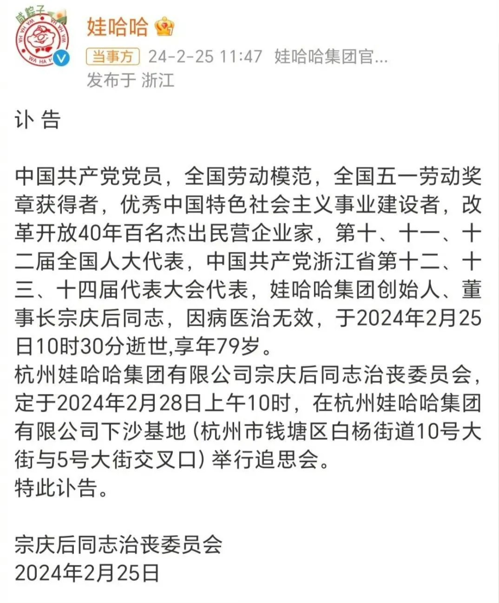 娃哈哈集团创始人、董事长宗庆后因病医治无效,于2024年2月25日10时30分去世,享年79岁。