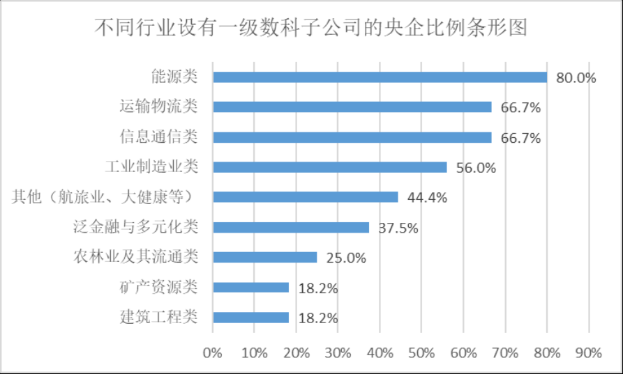 从行业布局角度看,不同行业的数字化转型进展不同,由不同行业设有一级数科子公司的央企数目占该行业总体央企数目的比例(如图),可以看出能源类、运输物流及信息通信类数字化转型进展较快,而矿产资源类和建筑工程类数字化水平相对较弱。