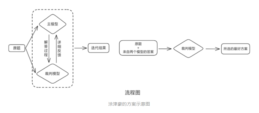 他的方法是,让大模型进行对话,你一言我一语寻找每个数学题的更好答案。他借鉴辩论的思想,并让这些不同的模型进行某种角色扮演。最终在模型的“对抗”中不停迭代答题方案,多轮对话后给出最优解。