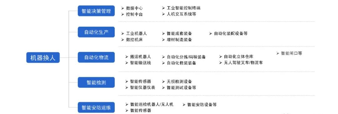 机器换人,柔性生产降本增效。机器换人将人们从简单的体力劳动层面提升到决策控制层,通过引入工业机器人、智能成套设备、自动化物流设备、智能检测设备等智能机器设备,实现柔性化生产、自动化生产,提高生产效率,降低能耗和成本。