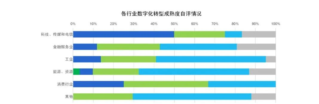 我国工业、能源企业数字化转型还处于早期阶段。根据德勤对145家企业的调查数据,目前国内超六成的访问企业已经启动了数字化,科技、传媒和电信,消费行业企业领跑数字化转型进程,而工业,能源、资源行业企业数字化转型较晚,还处于早期发展阶段。