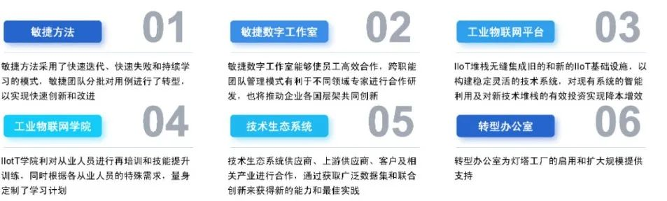 灯塔工厂引领制造业数字化智能化转型风向。灯塔工厂是第四次工业革命的成功实践者,通过分享其数字化智能化转型经验,为传统工业企业的数字化转型照亮前进方向。《全球灯塔网络:具有社会责任的行业转型实践指南》认为,灯塔工厂成功实现第四次工业革命转型的六大核心要素包括敏捷方法、敏捷数字工作室、工业物联网平台、工业物联网学院、技术生态系统和转型办公室。