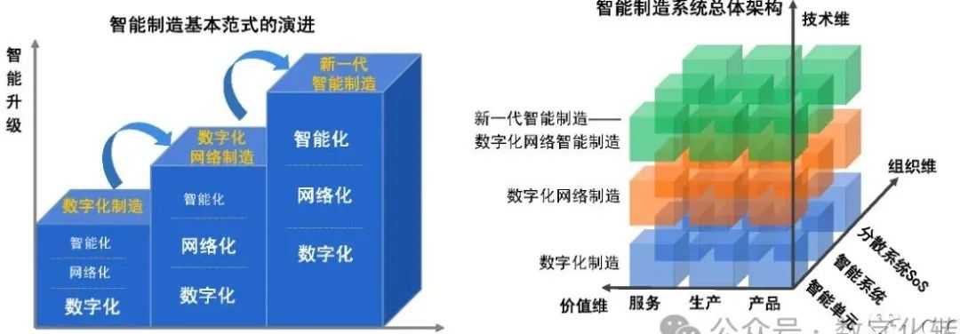 2018年,中国工程院提出了“新一代智能制造”的概念,认为智能制造是一个不断演进发展的大概念,可归纳为三个基本范式:数字化制造、数字化网络化制造、数字化网络化智能化制造——新一代智能制造。对比德国RAMI4.0,新一代智能制造架构强调了人工智能技术与先进制造技术的融合。