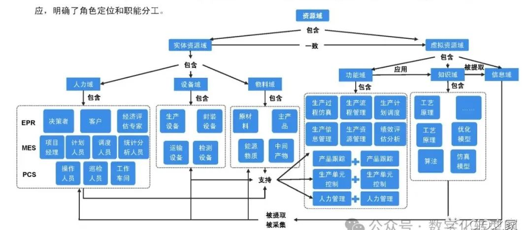 在资源内的映射关系中,人力域和设备域根据RAMI4.0中的水平维度进行划分,同时与ISA 95定义的三个层次对应,明确了角色定位和职能分工。