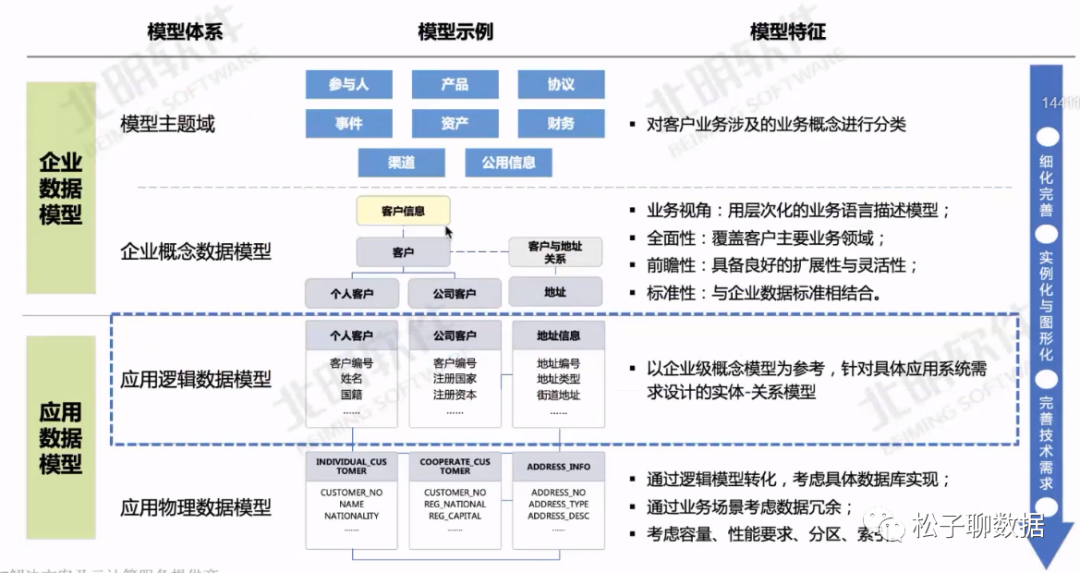 企业级数据模型建设方法:从全局入手,涉及标准化数据模型,构建统一的数据模型管控体系,丰富和完善数据实体相关属性信息,梳理数据实体之间的逻辑关系,最终形成不同主题域数据模型。