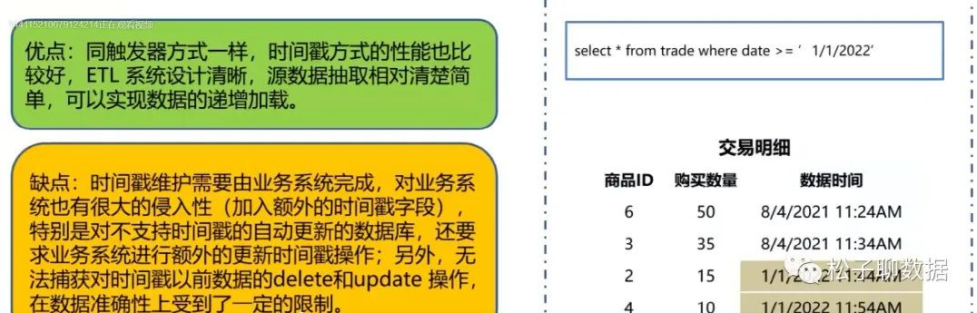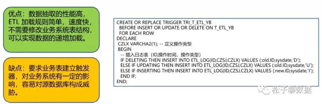 增量字段方式来捕获变化数据,原理就是在源系统业务表数据表中增加增量字段,增量字段可以是时间字段,同时也可以是自增长字段(如oracle的序列),设计要求就是源业务系统中数据新增或者被修改时,增量字段就会产生变化,时间戳字段就会被修改为相应的系统时间,自增长字段就会增加。每当ETL工具进行增量数据获取时,只需比对最近一次数据抽取的增量字段值,就能判断出来哪些是新增数据,哪些是修改数据。这种数据抽取方式的优点就是抽取性能比较高,判断过程比较简单,最大的局限性就是由于某些数据库在进行设计的时候,未考虑到增量字段,需要对业务系统进行改造,基于数据库其他方面的原因还有可能出现漏数据的情况。