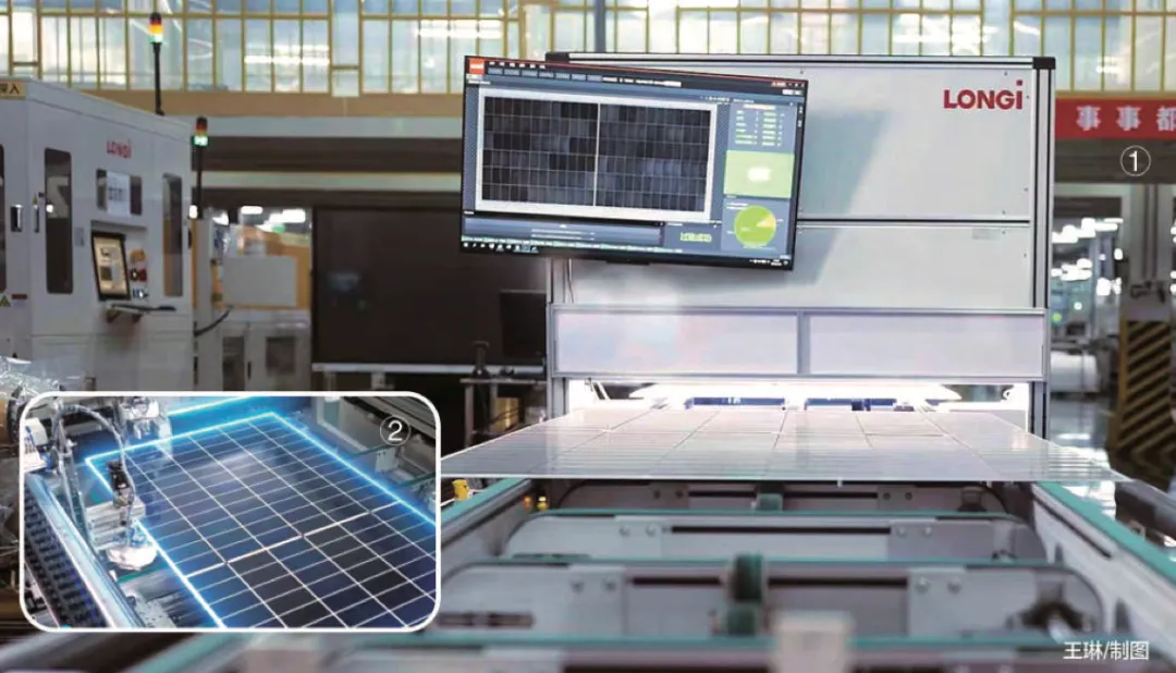 AI赋能的全流程视觉检测及精准追溯技术还让产品品质更具保障。一位隆基绿能的员工向记者解释称:“公司首创的基于图像特征的实时AI精准追溯技术,通过导入实时AI串追溯模型,可实现每18秒完成12个电池串异常及其来源机台的快速精准识别,从而解决了光伏组件生产过程中传统条码追溯不适用且虚拟码追溯准确率低的行业难题。”