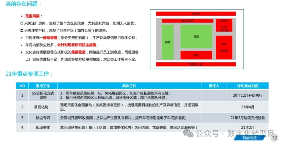 2、目视化统一推动缓慢(部分受费用影响),生产及异常信息目视化欠缺;车间内部灰尘较多,未针对现状研究防尘措施。数字化转型网www.szhzxw.cn