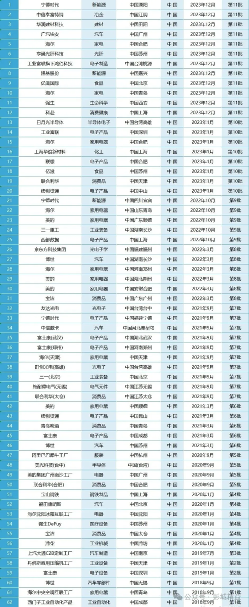 世界经济论坛—中国“灯塔工厂”62家名单
