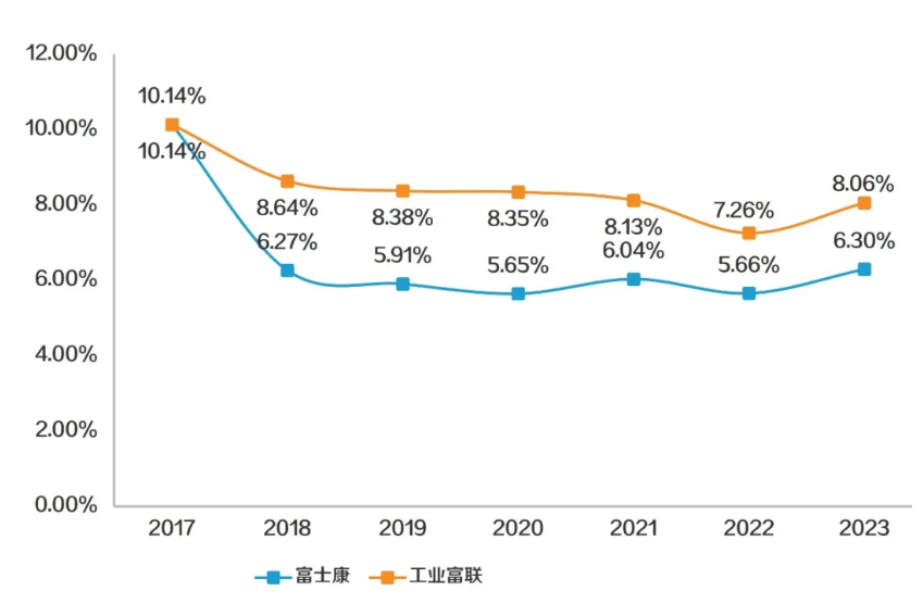 而从2018年至2023年,工业富联的毛利率分别为8.64%、8.38%、8.35%、8.13%、7.26%、8.06%,不仅不如同行立讯精密(近几年都在百分之十几左右),比富士康也仅仅高出一点而已。