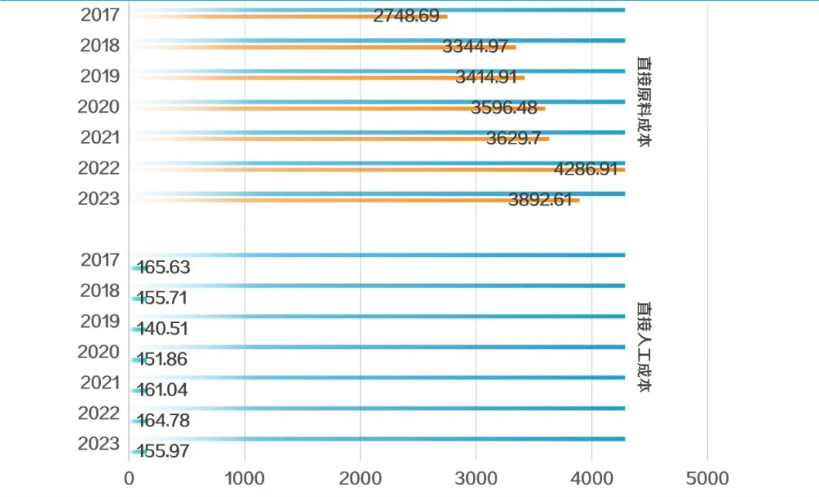 而同期直接原材料成本分别为2748.69亿元、3344.97亿元、3414.91亿元、3596.48亿元、3629.70亿元、4286.91亿元、3892.61亿元。公司电子产品制造生产所需的主要原材料为印制电路板(PCB)、零组件、集成电路(IC)、玻璃、金属材料、塑料等。