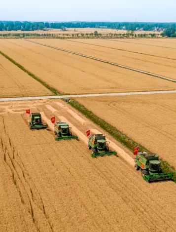 视频中,采收的软质冬小麦在前期经历严格的选种、育种田间管理后,在阳光下粒粒饱满,最终经过现代化收割,验收入库到低温仓储,每一颗原料都经过严格的质量检测,确保符合古井贡酒的高标准。