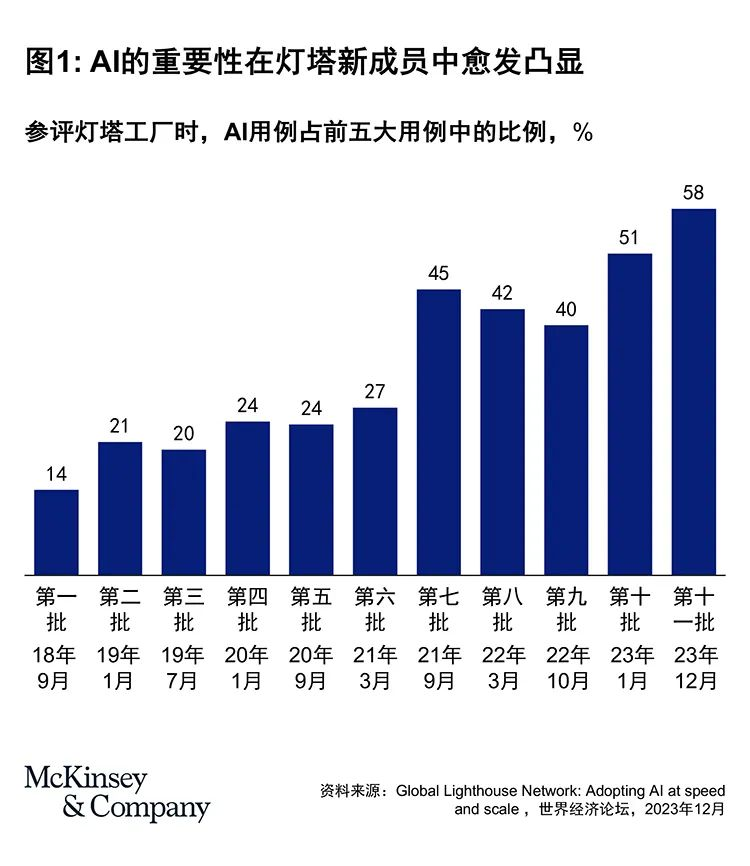 在前三批全球灯塔网络成员中,运用AI的用例仅有不足20%,但在2023年12月最新加入的21家灯塔工厂中,近60%的用例已开始借助AI的力量(见图1)。这一变革并非偶然:在这批新晋灯塔工厂中,基于AI的创新用例已取得瞩目成就,不仅使生产效率提升两至三倍,服务水平提升50%,也使缺陷率降低99%,能耗改善30%。 数字化转型网(www.szhzxw.cn)