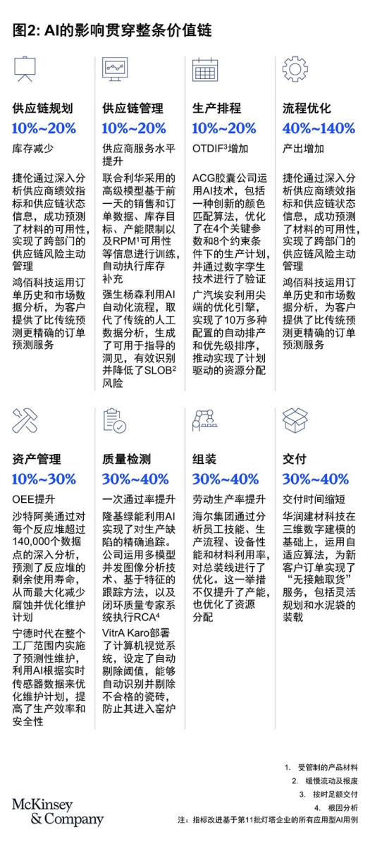 新晋灯塔工厂正是这种广泛性和多样性的明证。以规划为例,工业富联旗下鸿佰科技部署了一个AI需求预测模型,该模型通过训练历史数据,在短短三年内将预测准确率提升了27%;在工艺优化方面,亨通光纤运用历史策略训练的模型,自动调整预制坯和拉丝参数,实现了工艺最优化;在质量控制领域,VitrA Karo通过在其窑炉中部署计算机视觉系统,成功将废品率降低了68%;而在交付环节,华润建材科技通过自适应优化重型运输设备的路线,将提货周期缩短了39%(见图2)。