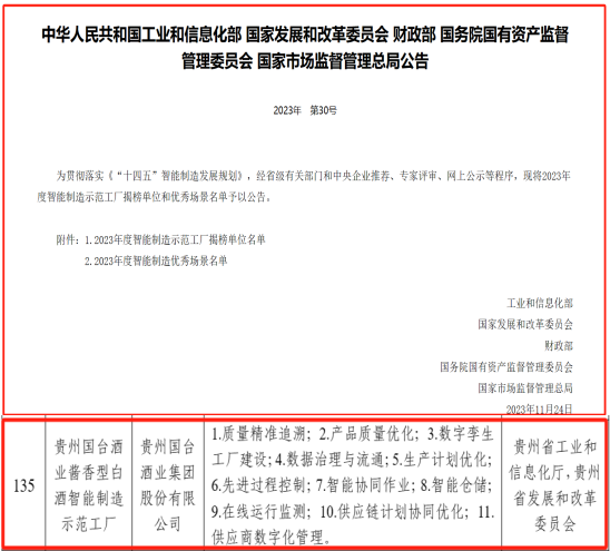 贵州国台酒业集团获评“2023年度智能制造示范工厂”揭榜单位,成为贵州白酒首家国家级智能制造示范工厂揭榜单位。