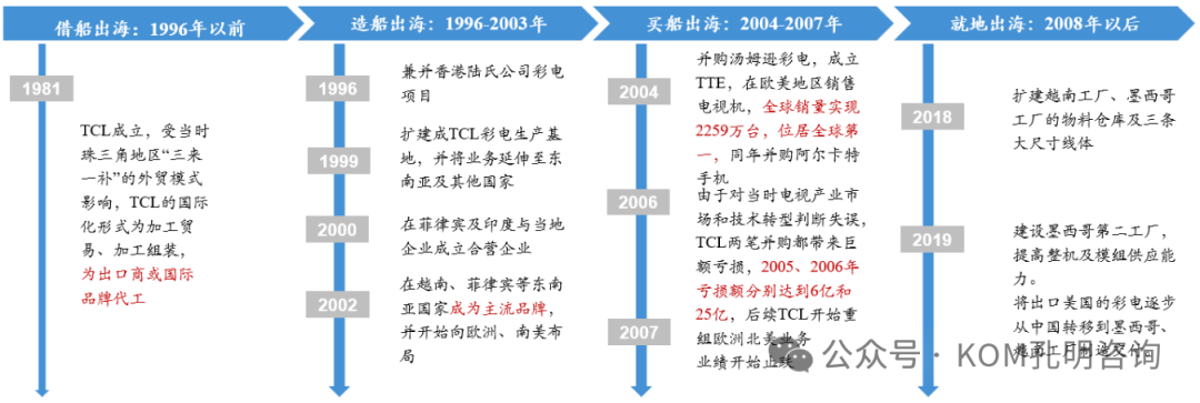 TCL的全球化可以分为借船出海-造船出海-买船出海-就地出海四个阶段: