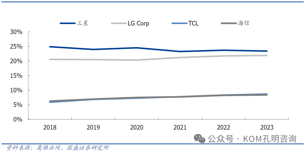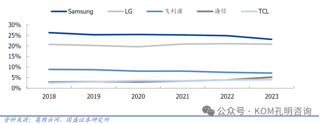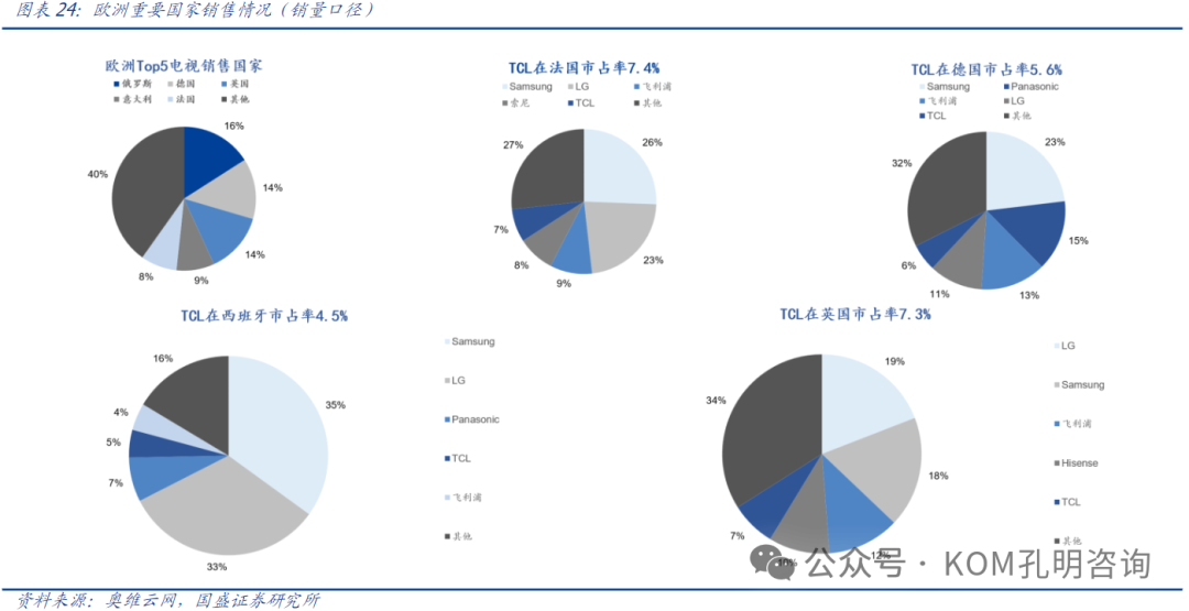3)欧洲市场中,TCL在法国市占率位列第二,西班牙、捷克、瑞典位列第三。TCL自并购法国汤姆逊业务开始在欧洲市场经营,法国市场一直是TCL核心市场。TCL在欧洲以法国市场为基础,将经营范围扩大到德国、英国、波兰、西班牙、意大利等市场。2020年TCL欧洲实现突破,销量增长66%,截至2023年TCL在欧洲市占率达4.1%。