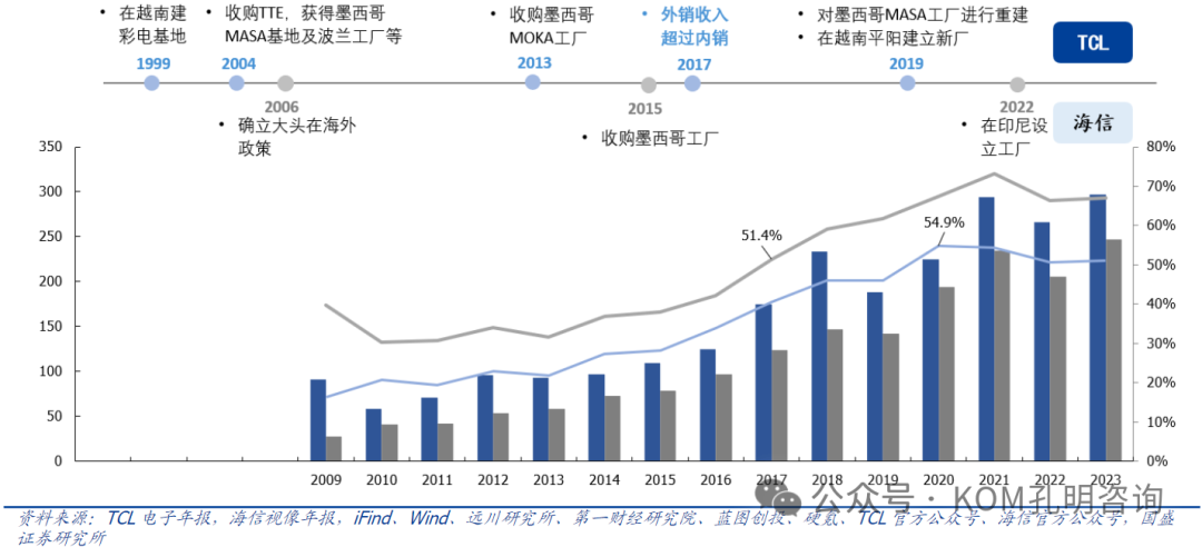 4)2008年至今为“就地出海”阶段。在跨国并购受阻后,TCL重归以自主品牌出海,逐步在世界各地建立供应链,从制造、销售、研发环节推进全球化。2016年,TCL外销销量超越内销量,实现1054万台;2018年,TCL对越南工厂进行扩建,扩建墨西哥工厂的物料仓库及三条大尺寸线体;2019年,TCL在墨西哥建设第二工厂,建立起整机及模组供应能力。外销业务贡献了TCL最大增长亮点,2008-2023年间,TCL内销销量下滑12.8%,对比外销销量增长156.4%。