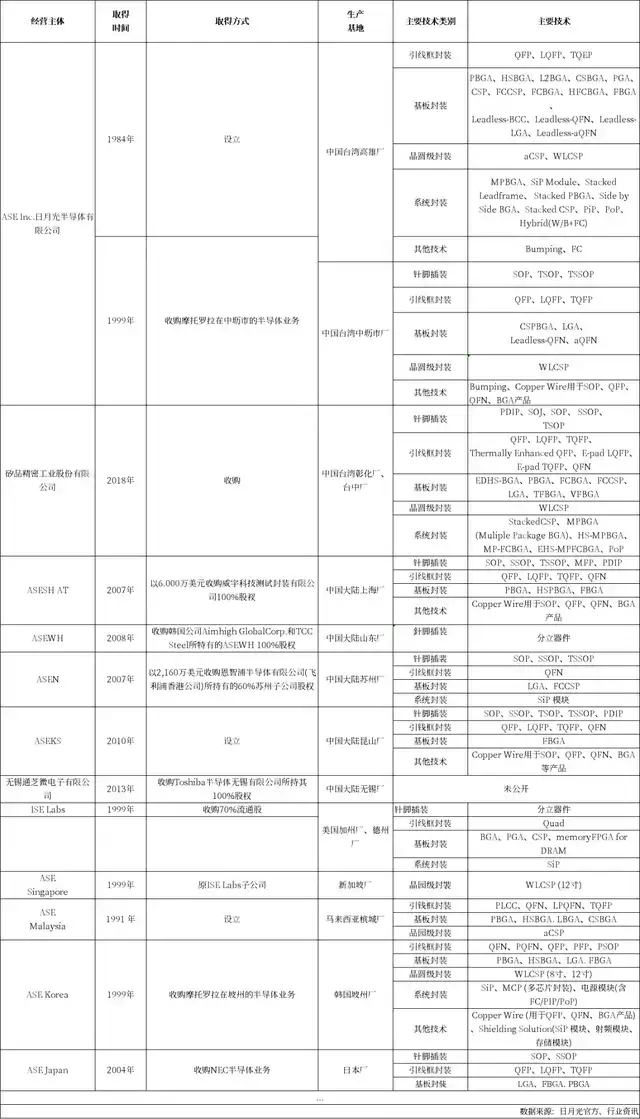 而在并购上,日月光集团丝毫不手软。据官方消息披露,自1984年成立日月光集团,1990年开启第一步并购芯片测试商福雷电子至今,日月光集团已先后收购了摩托罗拉在中国台湾中坜及韩国坡州的两座封装测试厂、美国硅谷ISE Labs的70%股权、环隆电气20.67%股份、NEC位于日本山形县的封装测试厂、上海张江的威宇科技、恩智浦(NXP)在苏州工厂的60%股权、山东威海爱一和一电子公司、环电98.9%股权、欧洲新义半导体(EEMS)旗下的新加坡工厂、中国台湾洋鼎科技、中国大陆无锡东芝封测厂、中国台湾第二大封测公司矽品精密、英飞凌旗下位于菲律宾和韩国的两座后段封测厂…