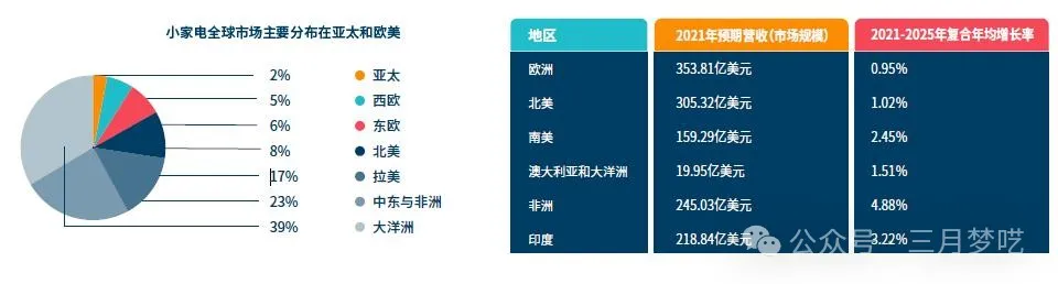 虽然欧美是海外最大的小家电市场,但北美市场趋于成熟,当地消费者的小家电平均拥有量已超过3个。而以英国、法国、德国为代表的欧洲市场仍有较大的增量空间,而亚洲地区则具备较高的发展潜力。
