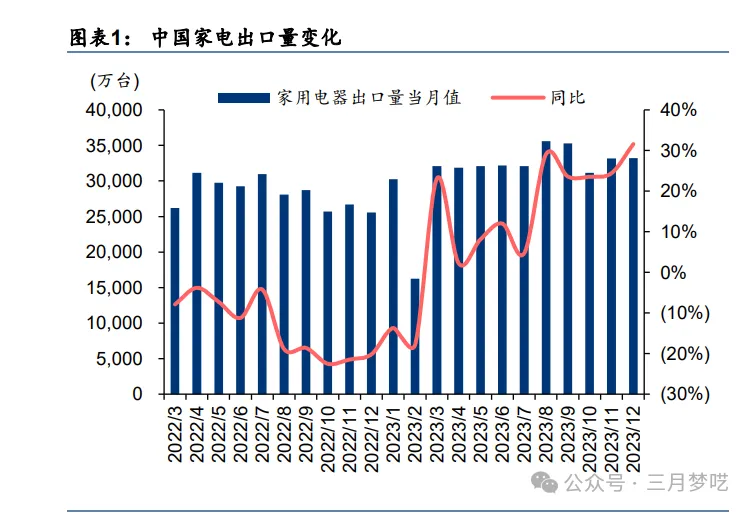 中国家电出海当前仍以直接出口为主,中国本土强大的供应链能力为中国家电企业产品提升全球市场份额提供了强有力的保障。家电出口数据自 2023 年 3 月恢复以来,表现出强大韧性,且表现明显好于中国整体出口。根据海外总署数据显示,2023 年全年中国出口总值(美元)同比-4.6%,弱于wind一致预 期的-4.5%,但家电出口表现积极,2023 年全年家用电器出口总值(美元)同比+3.8%, 家电出口表现大幅好于市场大盘。人民币量价角度来看,2023 年 12 月,家用电器出口量 33225 万台,同比+32%(1-12 月 累计同比+11.2%),出口金额(人民币)527 亿元,同比+19%(1-12 月累计同比+9.9%)。